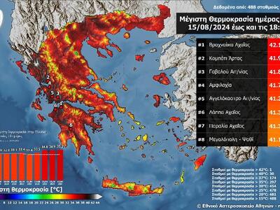 Πολύ υψηλές θερμοκρασίες καταγράφηκαν από το δίκτυο αυτόματων μετεωρολογικών σταθμών του meteo.gr/Εθνικού Αστεροσκοπείου Αθηνών την Πέμπτη 15/08.
