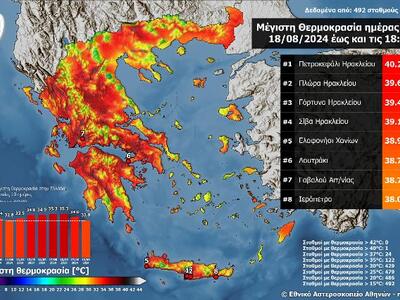 Yποχώρησε η θερμοκρασία την Κυριακή 18/08, διατηρούμενη ωστόσο σε υψηλά επίπεδα, ιδιαίτερα στην Κρήτη όπου σύμφωνα με το δίκτυο αυτόματων μετεωρολογικών σταθμών του meteo.gr/Εθνικού Αστεροσκοπείου Αθηνών καταγράφηκαν οι υψηλότερες θερμοκρασίες.