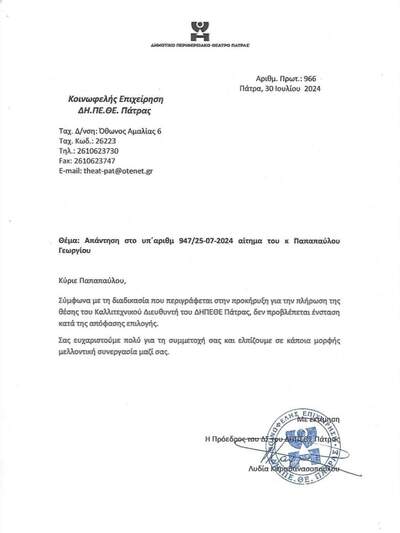 "Δεν έχουν τέλος οι διαμαρτυρίες ανθρώπων του πολιτισμού για όσα συμβαίνουν τελευταία στο ΔΗΠΕΘΕ Πάτρας, ενώ ακόμα δεν έχει κοπάσει ο σάλος με αφορμή την άνευ κριτηρίων επιλογή του Καλλιτεχνικού Διευθυντή. Το ένα λάθος διαδέχεται το άλλο και οι ατυχείς χειρισμοί της διοίκησης οδηγούν σε περαιτέρω ευτελισμό του πολιτιστικού φορέα του Δήμου Πατρέων, που στο παρελθόν είχε γνωρίσει στιγμές δόξας.