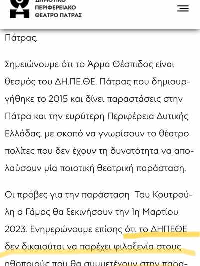 Παλαιότερα Δελτία Τύπου του ΔΗΠΕΘΕ Πάτρας άλλωστε (επισυνάπτονται αυτά που αφορούν παραγωγές του 2022 και 2023) αποδεικνύουν πως η πρόθεση για μη κάλυψη εξόδων διαμονής αποτελεί πάγια τακτική της διοίκησης. Άρα καθόλου εκ παραδρομής δεν ήταν η αρχική διατύπωση. Απλώς και το ΔΗΠΕΘΕ -όπως και η Δημοτική Αρχή γενικότερα- δεν συνηθίζουν να παραδέχονται λάθη, να ζητάνε συγνώμη και να διορθώνουν αστοχίες τους. Πονηριές, απαξίωση των καλλιτεχνών και επιμονή στο αλάθητο.