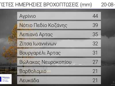 Ο μεγαλύτερος όγκος νερού έπεσε στο Αγρίνιο (44 χιλιοστά), και ακολούθησαν το Νότιο Πεδίο Κοζάνης (39 χιλιοστά) και τα Λεπιανά Άρτας (35 χιλιοστά).