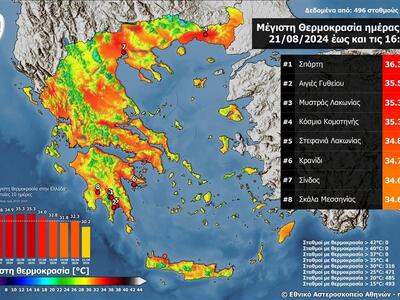 Όπως φαίνεται στον χάρτη της εικόνας που ακολουθεί, η μέγιστη θερμοκρασία την Τετάρτη καταγράφηκε στη Σπάρτη και ήταν ίση με 36.3 °C.