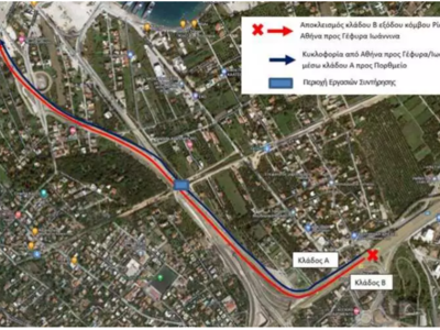 Στη διάρκεια των κυκλοφοριακών ρυθμίσεων, θα αποκλειστεί η έξοδος του αυτοκινητόδρομου από Αθήνα προς Γέφυρα/Ιωάννινα (Κλάδος Β) και η κίνηση των οχημάτων θα εξυπηρετείται από τον κλάδο προς Ρίο/Πορθμείο και στη συνέχεια προς Γέφυρα Ιωάννινα (Κλάδος Α), όπως φαίνεται στο ακόλουθο σχηματικό διάγραμμα.