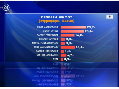 Για την πρόθεση ψήφου, οι ψηφοφόροι του ΠΑΣΟΚ απάντησαν «Νίκος Ανδρουλάκης» ενώ οι υπόλοιποι πολίτες που συμμετείχαν στην έρευνα, απάντησαν «Χάρης Δούκας».
