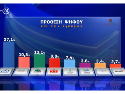 Σύμφωνα με τη δημοσκόπηση της Οpinion Poll, που έγινε το διάστημα μεταξύ 27 και 30 Αυγούστου, οι πολίτες απάντησαν ότι αν γίνονταν εκλογές θα ψήφιζαν ΝΔ σε ποσοστό 27,1%, ΠΑΣΟΚ (13,1)% και ΣΥΡΙΖΑ (10,5%)