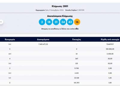 Oλοκληρώθηκε η κλήρωση του Τζόκερ που πραγματοποιήθηκε την Τρίτη 3 Σεπτεμβρίου 2024, με κέρδη πάνω από 7,4 εκατ. ευρώ.