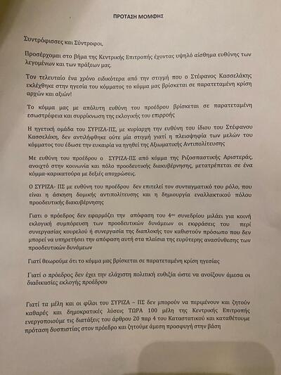 Έπειτα από την ομιλία του Στέφανου Κασσελάκη στην ΚΕ του ΣΥΡΙΖΑ, οι 87 κατέθεσαν πρόταση μομφής αμφισβητώντας ευθέως τον πρόεδρο του κόμματος.