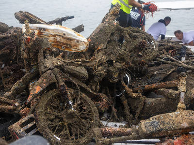 Ηλεκτρικά πατίνια, ποδήλατα, ελαστικά οχημάτων, κούπες, πλαστικά μπουκάλια, σκαμπό, ακόμη και βάση ομπρέλας, «ψάρεψαν» το πρωί της Τρίτης δύτες που βούτηξαν στον Θερμαϊκό Κόλπο, στο ύψους του Λευκού Πύργου, στη Θεσσαλονίκη.