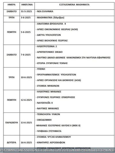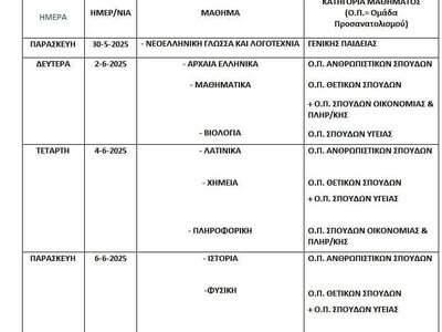 Τα μαθήματα και οι ημερομηνίες εξέτασης