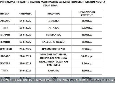 Οι εξετάσεις των ειδικών μαθημάτων θα πραγματοποιηθούν κατά το διάστημα 14-25 Ιουνίου 2025, ενώ προθεσμία διεξαγωγής της Υγειονομικής Εξέτασης και Πρακτικής Δοκιμασίας των υποψηφίων (ΓΕΛ και ΕΠΑΛ) για εισαγωγή στα Τμήματα Επιστήμης Φυσικής Αγωγής και Αθλητισμού (ΤΕΦΑΑ) ορίστηκε το διάστημα από τη Δευτέρα 16-6-2025 μέχρι και την Παρασκευή 27-6-2025.
