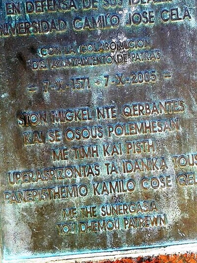 Σύμφωνα, με τη διαμαρτυρία, του κ. Χαλούλου: «Στην Πάτρα, στην είσοδο του πάρκου, τέρμα της οδού Παπαφλέσσα, κοντά στο Φάρο και απέναντι από το ναό του Αγ. Ανδρέα έχει στηθεί από τον Οκτώβριο 2005 προτομή του Ισπανού λογοτέχνη Μιχαήλ Θερβάντες. Ο Θερβάντες (το διασημότερο μυθιστόρημά του είναι «Ο Δον Κιχώτης») συμμετείχε στη ναυμαχία της Ναυπάκτου, 1571 μ. Χ., όπου τραυματίστηκε και αχρηστεύτηκε το αριστερό του χέρι. Το κείμενο της επιγραφής στη βάση της προτομής είναι γραμμένο στην ισπανική γλώσσα και από κάτω μεταφράζεται στην ελληνική.