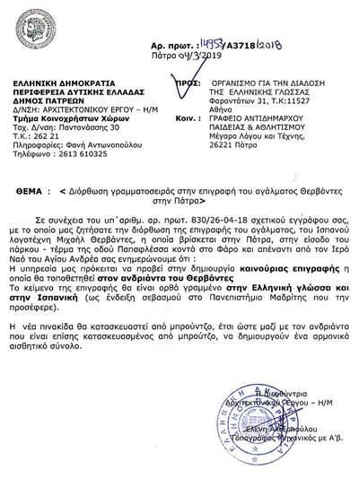 «Το Μάιο 2016 είχα στείλει ηλεκτρονικά στο Δήμο Πατρέων την παραπάνω αναφορά μου και έλαβα απάντηση, που με παρέπεμπε για περισσότερες πληροφορίες στον πατρινό γλύπτη, ο οποίος είχε αναλάβει με παραγγελία από το Δ.Π. (2005) να ετοιμάσει το βάθρο για την προτομή» τονίζει και στη συνέχεια παραθέτει την απάντηση που έλαβε: «Η απάντηση από το Γραφείο Τύπου του Δ.Π.: Θέλουμε να σας ενημερώσουμε ότι η προτομή του Θερβάντες είναι έργο του μεγάλου Ισπανού γλύπτη Σαντιάγκο ντε Σαντιάγκο και αποτελεί δωρεά του Πανεπιστημίου της Μαδρίτης. Η επιγραφή που είναι από χυτοσίδηρο ήρθε έτοιμη το 2005 από την Ισπανία και τοποθετήθηκε την ημέρα των εγκαινίων από τους δωρητές. Οι εκπρόσωποι του Πανεπιστημίου είχαν παραγγείλει στον γνωστό πατρινό γλύπτη Στάθη Λεοντή τη γρανιτένια βάση σύμφωνα με τις προδιαγραφές που είχαν θέσει και πάνω σε αυτή κόλλησαν την επιγραφή που έφεραν. Όπως μπορεί να σας ενημερώσει και ο κ. Λεοντής, κάθε προσπάθεια αποκόλλησης της επιγραφής θα μπορούσε να καταστρέψει τη γρανιτένια βάση».