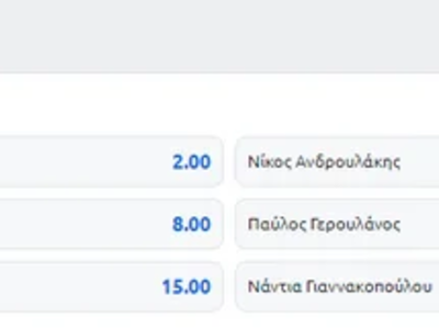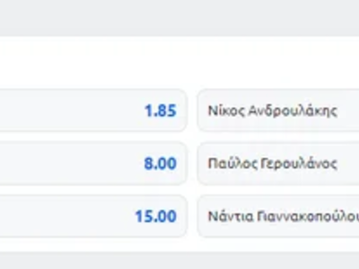 Ο Χάρης Δουκας πλέον εμφανίζεται ως το πρώτο φαβορί στη Stoiximan με απόδοση 2.00 από 2.40 και ο Νίκος Ανδρουλάκης δεύτερος με 2.15 από 1.85, κάτι που δείχνει ότι όσο πλησιάζουμε τις κάλπες τόσο θα κλείνει και η «ψαλίδα» μεταξύ των φαβορί.