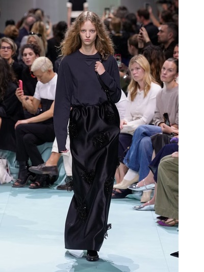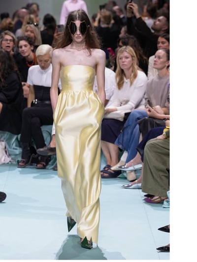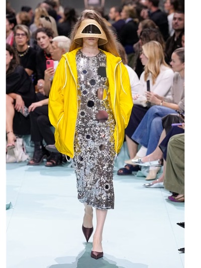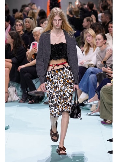 Ως περιζήτητη tv star ήταν επίσημη καλεσμένη του πανίσχυρου οίκου Prada, που βέβαια υπέγραψε το φόρεμά της. Στην πασαρέλα παρουσιάστηκαν διάφορες μακριές φούστες και φορέματα που φούσκωναν στην περιφέρεια αλλά και διάκοσμος με διαστημικά, μεταλλικά στοιχεία. Περίεργα γυαλιά και καπέλα τράβηξαν την προσοχή καθώς το ρετρό και ο φουτουρισμός σμίγουν εδώ δημιουργικά.