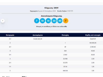 Οι τυχεροί αριθμοί της αποψινής κλήρωσης είναι 7, 10, 14, 35, 40 και Τζόκερ το 7.