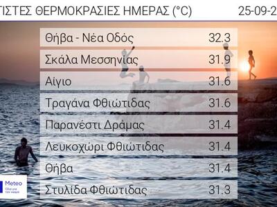 Ξεπέρασε τους 32 °C η θερμοκρασία το μεσημέρι της Τετάρτης 25/09. Σύμφωνα με τις καταγραφές του δικτύου αυτόματων μετεωρολογικών σταθμών του meteo.gr / Εθνικού Αστεροσκοπείου Αθηνών, η μέγιστη θερμοκρασία σημειώθηκε στη Θήβα – Νέα Οδός και ήταν ίση με 32.3 °C.