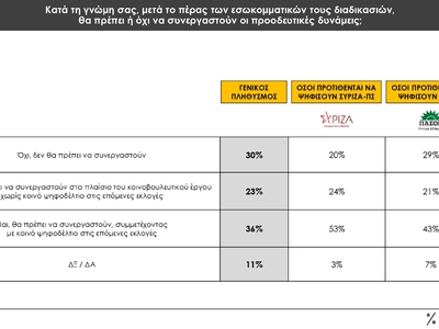 Υψηλό είναι και το ποσοστό των ψηφοφόρων του ΠΑΣΟΚ που τάσσεται υπέρ της συνεργασίας, με το 43% να συμφωνεί στην κοινή εκλογική κάθοδο και το 21% να θεωρεί ότι η συνεργασία θα πρέπει να περιοριστεί μόνο εντός Βουλής.