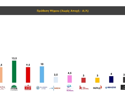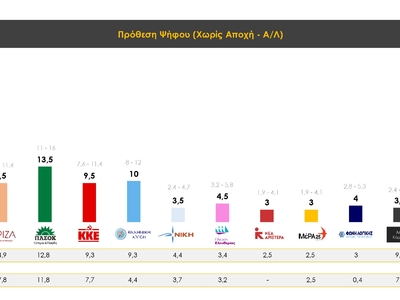 Η Νέα Δημοκρατία στην πρόθεση ψήφου εμφανίζεται να συγκεντρώνει το 24%. Την ίδια ώρα το άθροισμα των ποσοστών της Ελληνικής Λύσης, της Νίκη και της Φωνής Λογικής φτάνει στο 17,5%. Το ΠΑΣΟΚ βρίσκεται στη δεύτερη θέση με 13,5% με τον ΣΥΡΙΖΑ και το ΚΚΕ να δίνουν μάχη επικράτησης στη ζώνη του 9 με 10%.