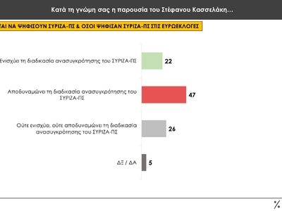 Στον ΣΥΡΙΖΑ, καταγράφονται μεγάλες αλλαγές, με το 47% των ερωτηθέντων ψηφοφόρων του να δηλώνει ότι η παρουσία του Στέφανου Κασσελάκη στην ηγεσία αποδυναμώνει την προοπτική ανασυγκρότησης του κόμματος και το 63% να θεωρεί ότι ο Αλέξης Τσίπρας θα διαδραματίσει ρόλο στις εξελίξεις της κεντροαριστεράς. Σχετικά με τις εσωκομματικές εκλογές για την ανάδειξη νέου αρχηγού, ο Στέφανος Κασσελάκης εμφανίζεται να προηγείται με 27%, το σύνολο ωστόσο όσων υποστηρίζουν τις υποψηφιότητες Φάμελλου και Γεροβασίλη (η έρευνα ολοκληρώθηκε την ίδια μέρα που η πρώην υπουργός ανακοίνωσε ότι δεν θα διεκδικήσει την Προεδρία) βρίσκεται στα ίδια επίπεδα.