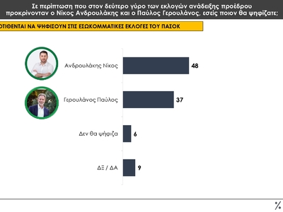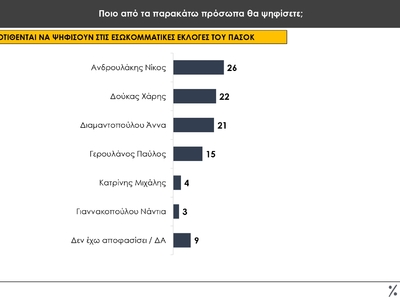 Στο ΠΑΣΟΚ προβάδισμα έναντι των αντιπάλων του στον πρώτο γύρο εμφανίζεται να διατηρεί ο Νίκος Ανδρουλάκης με 26%, ακολουθούμενος από τον Χάρη Δούκα με 22% και την Άννα Διαντοπούλου με 21%. Στο 15% καταγράφεται ο Παύλος Γερουλάνος, 4% αποσπά η Μιχάλης Κατρίνης και 3% η Νάντια Γιαννακοπούλου.