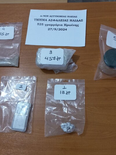 Ειδικότερα, οι αστυνομικοί του Τμήματος Ασφάλειας Ήλιδας, αξιοποιώντας πληροφορίες, πραγματοποίησαν έρευνα στην οικία του κατηγορούμενου, κατά την οποία βρήκαν και κατέσχεσαν (525) γραμμάρια ηρωίνης και μια ηλεκτρονική ζυγαριά ακριβείας, με υπολείμματα της ναρκωτικής ουσίας.