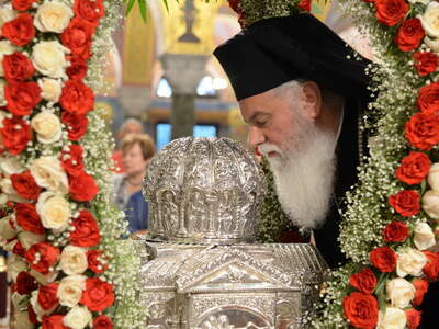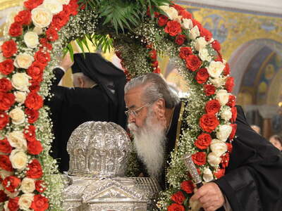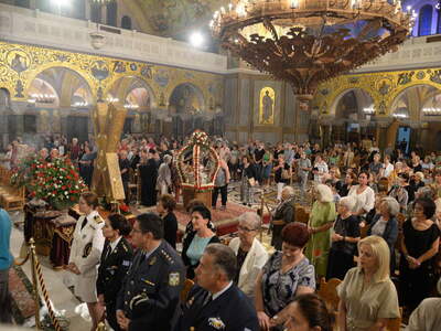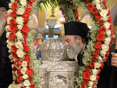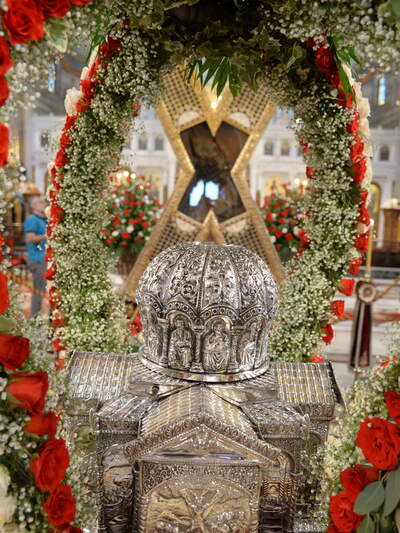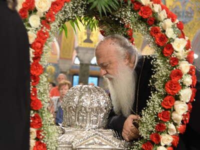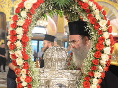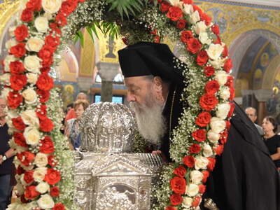 Τό πρωί τοῦ Σαββάτου ἐλιτανεύθη ἐντός τοῦ Ἱεροῦ Ναοῦ τοῦ Ἀποστόλου Ἀνδρέου ἡ πανσεβάσμια Κάρα του καί ἐτοποθετήθη στό μέσον τοῦ Ναοῦ πρός προσκύνησιν ὑπό τοῦ εὐσεβοῦς Λαοῦ.