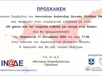 «50 χρόνια από την τουρκική εισβολή και κατοχή στην Κύπρο» είναι ο τίτλος της άκρως ενδιαφέρουσας εκδήλωσης που θα πραγματοποιηθεί στην Αίθουσα του Αρχαιολογικού Μουσείου Πατρών, την Παρασκευή 11 Οκτωβρίου και ώρα 17.30.