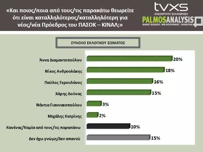 Στις εκλογές του ΠΑΣΟΚ, στο σύνολο του εκλογικού σώματος, η Αννα Διαμαντοπούλου (20%) προηγείται με μικρή διαφορά του Νίκου Ανδρουλάκη (18%), ενώ ακολουθούν ο Παύλος Γερουλάνος με 16%, ο Χάρης Δούκας με 15%.