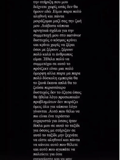 «Είμαι πάρα πολύ ευγνώμων για όλη αυτή την αγάπη και την στήριξη που μου δείχνετε, χωρίς εσάς δεν θα ήμουν εδώ. Είμαι πάρα πολύ αληθινή και πάντα μοιράζομαι μαζί σας την ζωή μου. Διάβασα κάποια αρνητικά σχόλια για την συμμετοχή μου στο Survivor. Δυστυχώς, ο κόσμος κρίνει και κρίνει χωρίς να ξέρει. Όσοι με ξέρουν, ξέρουν πολύ καλά τι άνθρωπος είμαι» αναφέρει.