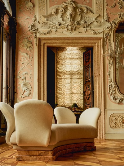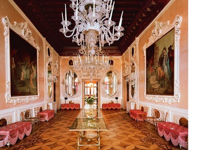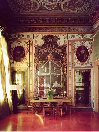 To «διαμέρισμα» στη Βενετία διατηρεί βέβαια το μνημειακό μπαρόκ του διάκοσμο. αλλά συνδυάστηκε με custom made σύγχρονα έπιπλα και έργα τέχνης. Mπήκαν βιβλιοθήκες, αποθηκευτικοί χώροι και βιβλιοθήκες με ροδάκια που αποδεικνύουν τη «νομαδική» φιλοσοφία της οικοδέσποινας.