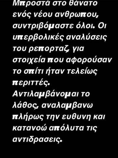 «Μπροστά στο θάνατο ενός νέου ανθρώπου, συντριβόμαστε όλοι. Οι υπερβολικές αναλύσεις του ρεπορτάζ, για στοιχεία που αφορούσαν το σπίτι ήταν τελείως περιττές. Αντιλαμβάνομαι το λάθος, αναλαμβάνω πλήρως την ευθύνη και κατανοώ απόλυτα τις αντιδράσεις», έγραψε ο Γιώργος Λιάγκας.
