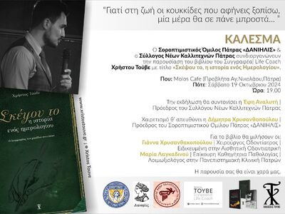 Ο Σοροπτιμιστικός Όμιλος Πάτρας «Δανιηλίς» & ο Σύλλογος Νέων Καλλιτεχνών Πάτρας συνδιοργανώνουν την εκδήλωση παρουσίασης βιβλίου του συγγραφέα και Life Coach Χρήστου Τούβε με τίτλο «Σκέψου το, η ιστορία ενός Ημερολογίου».
