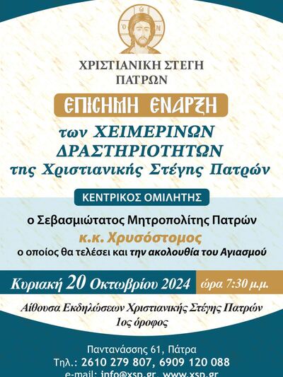 Η Χριστιανική Στέγη Πατρών που εδρεύει στην οδό Παντανάσσης 61, πραγματοποιεί την επίσημη έναρξη των χειμερινών δραστηριοτήτων της, για τη νέα περίοδο αυτή την Κυριακή 20 Οκτωβρίου 2024 και ώρα 7:30 μ.μ. στην αίθουσα εκδηλώσεών της στην Παντανάσσης.
