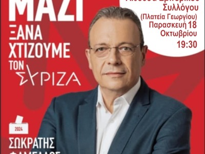 Ο υποψήφιος πρόεδρος του ΣΥΡΙΖΑ- ΠΣ Σωκράτης Φάμελλος επισκέπτεται σήμερα Παρασκευή την Πάτρα.