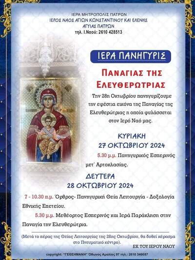 Όπως αναφέρει σχετική ανακοίνωση, στον συγκεκριμένο ιερό ναό την 28η Οκτωβρίου πανηγυρίζουν την εφέστια εικόνα της Παναγίας Ελευθερώτριας που φυλάσσεται στο ναό.