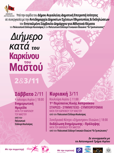 Ο Δήμος Αιγιαλείας σε συνεργασία με την Δημοτική Επιτροπή Ισότητας, την Πρόεδρό της και Αντιδήμαρχο Νομικών Υπηρεσιών κυρία Μαρία Ιατροπούλου, την Αντιδήμαρχο Δημοσίων Σχέσεων Εθιμοτυπίας και Εκδηλώσεων κ. Μαρία Αγγελοπούλου, τον Εντεταλμένο Δημοτικό Σύμβουλο για Αθλητικά Θέματα, κ. Χρήστο Τσερεντζούλια, τον Πολιτιστικό Σύλλογο Κουλούρας και τον Πολιτιστικό Σύλλογο Γυναικών Ελαιώνα “Οι Τρυπιώτισσες”, πραγματοποιούν αυτό το Σάββατο 2 και την Κυριακή 3 Νοεμβρίου 2024, διήμερο εκδηλώσεων κατά του Καρκίνου του Μαστού.