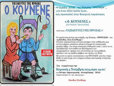 Η ομάδα ¨Στέκι¨ της Κίνησης ¨Πρόταση¨ για έναν άλλο τρόπο ζωής , σας προσκαλεί στην θεατρική παράσταση «Ο Κουνενές» του Κώστα Πρετεντέρη από τους «Ταξιδευτές της Πρόζας»