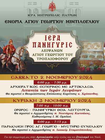 Όπως αναφέρει η σχετική ανακοίνωση, ο Ιερός Ναός Αγίου Γεωργίου Μιντιλογλίου Πατρών, ο οποίος έχει την εξαιρετική ευλογία να κατέχει τμήμα του λειψάνου του Αγίου Γεωργίου, θα πανηγυρίσει την εορτή και καλεί τον κόσμο να συμμετέχει.