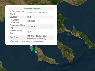 Ο δεύτερος σεισμός στις 19.07 είχε ένταση 4,2 Ρίχτερ με το επίκεντρο να εντοπίζεται 11 χιλιόμετρα νότια νοτιοδυτικά των Νέων Μουδανιών Χαλκιδικής με εστιακό βάθος 8,3 χιλιόμετρα.