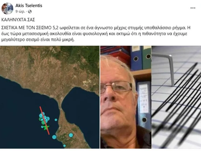 Σύμφωνα με τον διευθυντή του Γεωδυναμικού Ινστιτούτου, Άκη Τσελέντη, ο σεισμός των 5,2 Ρίχτερ «οφείλεται σε ένα άγνωστο μέχρις στιγμής υποθαλάσσιο ρήγμα».