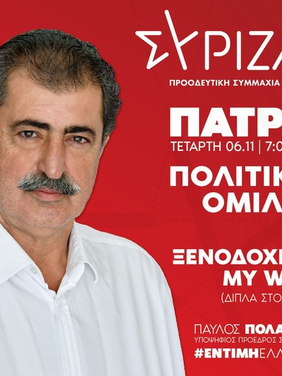 Ο υποψήφιος Πρόεδρος του ΣΥΡΙΖΑ ΠΣ Παύλος Πολάκης συνεχίζει τις περιοδείες του σε όλη τη χώρα με επόμενο σταθμό την Πάτρα, την Τετάρτη 6 Νοεμβρίου.