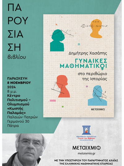 Αναβάλλεται, λόγω προσβολής του συγγραφέα από covid, η προγραμματισμένη εκδήλωση από το παράρτημα Αχαΐας της Ελληνικής Μαθηματικής Εταιρείας, το βιβλιοπωλείο Γωνιά του Βιβλίου της οικογένειας Παπαχρίστου και τις εκδόσεις Μεταίχμιο για το νέο βιβλίο του Δημήτρη Χασάπη «Γυναίκες μαθηματικοί στο περιθώριο της Ιστορίας».