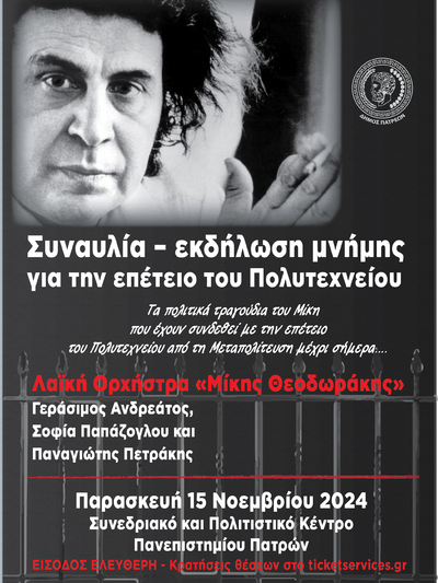 Την Παρασκευή 15 Νοεμβρίου στις 9 το βράδυ στο Συνεδριακό και Πολιτιστικό Κέντρο Πανεπιστημίου Πατρών, στο Ρίο θα πραγματοποιηθεί Συναυλία – εκδήλωση μνήμης για την επέτειο του Πολυτεχνείου με την Λαϊκή Ορχήστρα «Μίκης Θεοδωράκης».