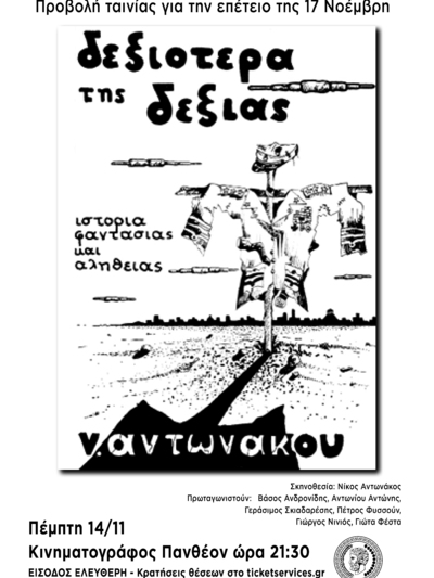 Την Πέμπτη 14 Νοεμβρίου 2024 στις 21.30 στο «Πάνθεον» προβάλλεται το φιλμ του Νίκου Αντωνάκου «Δεξιότερα της δεξιάς» - Η συναυλία θα γίνει την Παρασκευή 15-11 στο Συνεδριακό του Πανεπιστημίου Πατρών στις 21.00