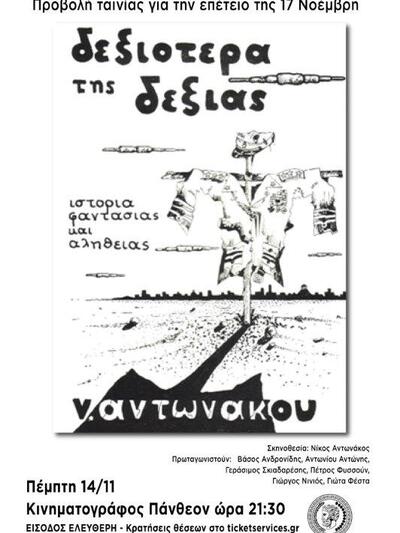 H προβολή της ταινίας του Νίκου Αντωνάκου «Δεξιότερα της δεξιάς», με πρωταγωνιστές τους Βάσο Ανδρονίδη, Αντωνίου Αντώνη, Γεράσιμο Σκιαδαρέση, Πέτρο Φυσσούν, Γιώργο Νινιό και Γιώτα Φέστα, ανοίγει στις 9.30 το βράδυ την Πέμπτη 14 Νοεμβρίου στο «Πάνθεον» τον κύκλο των τριήμερων εκδηλώσεων που διοργανώνει ο Δήμος της Πάτρας για την συμπλήρωση 51 χρόνων από την εξέγερση του Πολυτεχνείου.