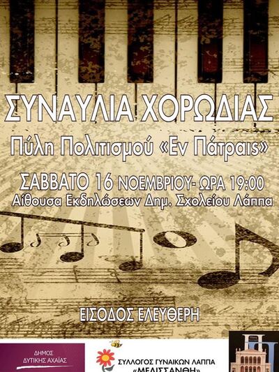 Συναυλία χορωδίας, μια μοναδική μουσική εμπειρία για μικρούς και μεγάλους ετοιμάζει ο Πολιτιστικός Σύλλογος Γυναικών Λάππα «Μελισσάνθη» σε συνεργασία με το Δήμο Δυτικής Αχαΐας το Σάββατο 16 Νοεμβρίου.