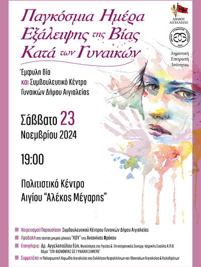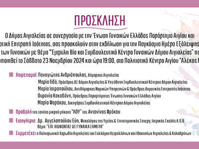 Με αφορμή την Παγκόσμια Ημέρα Εξάλειψης της Βίας κατά των Γυναικών και παράλληλα τη λειτουργία του Συμβουλευτικού Κέντρου Γυναικών στο Αίγιο, ο Δήμος Αιγιαλείας σε συνεργασία με την Ένωση Γυναικών Ελλάδας-Παράρτημα Αιγίου και τη Δημοτική Επιτροπή Ισότητας, οργανώνουν εκδήλωση με θέμα "Έμφυλη βία και Συμβουλευτικό Κέντρο Γυναικών Δήμου Αιγιαλείας", το Σάββατο 23 Νοεμβρίου στις 7 μ.μ. στο Πολιτιστικό Κέντρο Αιγίου "Αλέκος Μέγαρης".