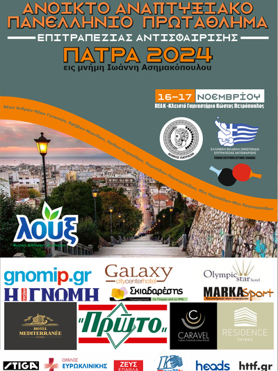 Θυμίζουμε ότι στο Πανελλήνιο αναπτυξιακό πρωτάθλημα Πάτρα 2024 είναι Μέγας χορηγός η "Λουξ" Μαρλαφέκας ΑΒΕΕ κι επίσης χορηγοί τα ξενοδοχεία Mediterranne, Galaxy City Center Hotel, Residence Patras Hotel, Olympic Star Hotel. η λουκουμοποιία Σκιαδαρέση, τα ζαχαροπλαστεία Caravel και το εργοστάσιο γάλακτος Πρώτο. Ακόμα χορηγοί επικοινωνίας ανέλαβαν η εφημερίδα Γνώμη, το gnomip.gr και το Marka sport. Η Τ.Ε. Δυτικής Ελλάδας της Ε.Φ.Ο.Επ.Α. «τούς ευχαριστεί θερμά για μία ακόμη φορά για τη συμπαράστασή τους και την προσφορά τους».