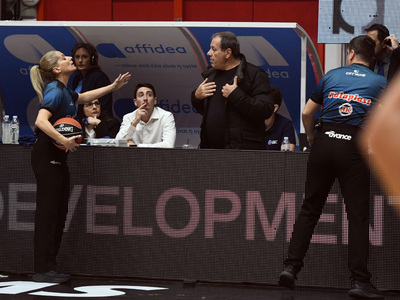 Νέα ένταση στο ματς, με τους διαιτητές να ζητούν την απομάκρυνση ανθρώπου των κιτρινόμαυρων, ο οποίος καθόταν μαζί με τον Μάκη Αγγελόπουλο στις θέσεις πίσω από την μπασκέτα. Ο ισχυρός άνδρας της ΑΕΚ κατευθύνθηκε προς τη γραμματεία και ζήτησε εξηγήσεις. Η διαιτητική τριάδα αποχώρησε προσωρινά προς τα αποδυτήρια, μέχρι οι πολυθρόνες των επισήμων να μεταφερθούν μερικά μέτρα πίσω από τις διαφημιστικές πινακίδες για να συνεχιστεί η αναμέτρηση.