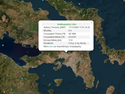 Σεισμική δόνηση 2,4 βαθμών της κλίμακας Ρίχτερ σημειώθηκε το απόγευμα της Κυριακής στην Αττική.